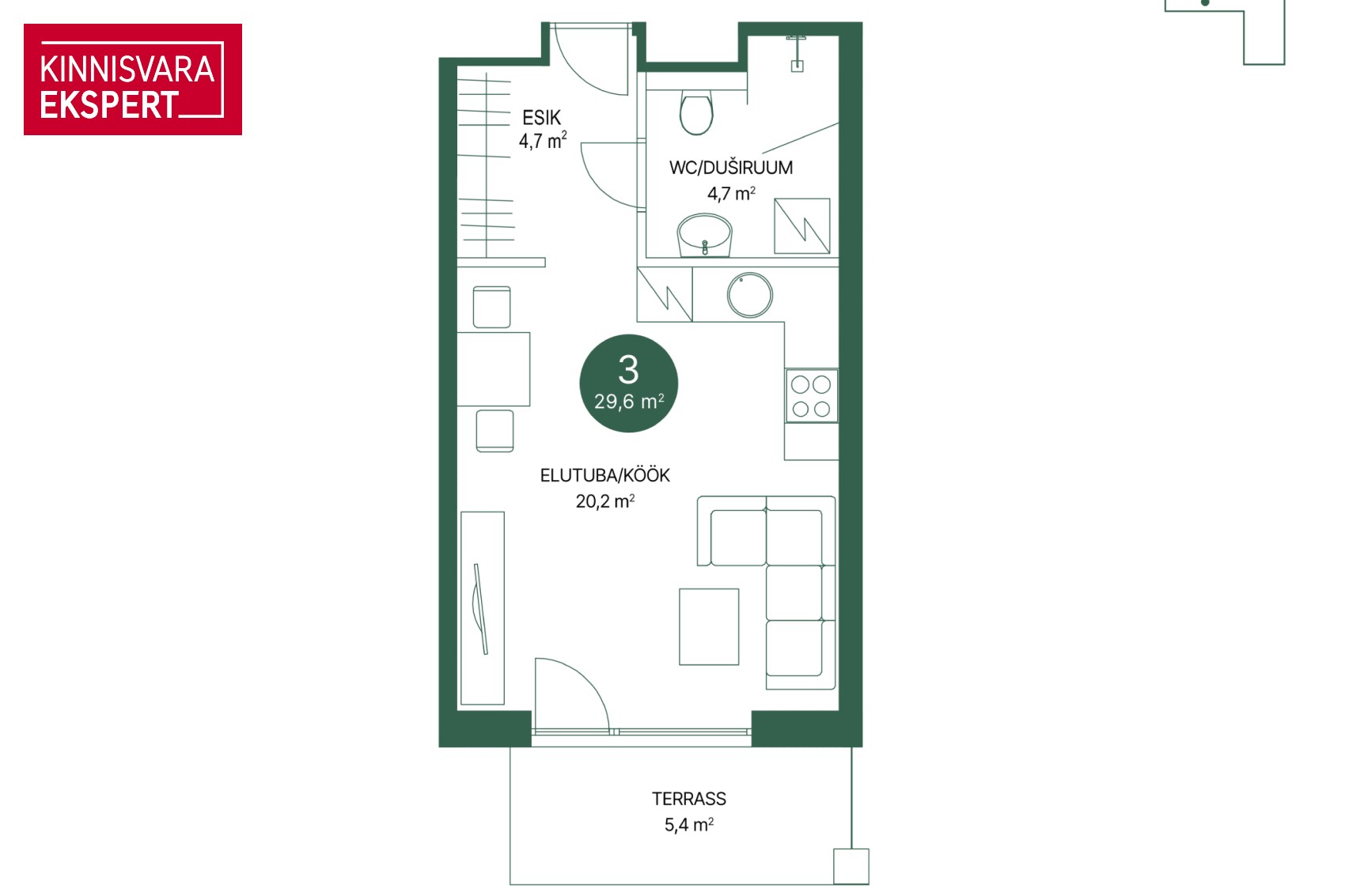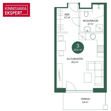 1toaline oma terrassi ja selle esise õuealaga korter nr 3 (29,6 m² + terrass 5,4 m² + õueala) paikneb maja I korrusel akendega lõuna/õhtupäikese poole. Elutoa-köögi suurus on 20,2 m², lisaks duširuum/WC (4,7 m²) ja esik (4,7 m²). Soovi korral on arendajalt võimalik korter osta koos köögimööbliga (lisandub korteri hinnale, võimalik finantseerida eluasemelaenu koosseisus). Samuti on korterise võimalik lisada jahutus (lisatasu eest) ning juurde osta panipaik (hind vastavalt suurusele) ja isiklik parkimiskoht (kas I korruse perimeetris või avaparklas, sh võimalus lisada elektriühendus). Kiirematele parem valik ja paindlikumad võimalused korteri valmimise juures kaasa rääkida!